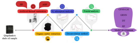 为了阐明水在热成熟过程中对页岩孔隙结构演化的影响,这项研究对青山口组页岩进行了300-450°C范围内无水和有水热解实验(AHP和HP),并对加热至不同热演化阶段的页岩样品开展了可溶有机质抽提前后的X射线衍射(XRD)、岩石热解分析(Rock-eval)和氮气吸附实验,以分析其矿物成分、地球化学性质和孔隙结构变化规律。分析过程利用分形维数表征了孔隙结构的复杂性,将反褶积方法应用于各个样品的孔径分布,以精细对比孔隙大小的演化过程,并建立了氮气吸附-解吸过程的AI模型(图1)。