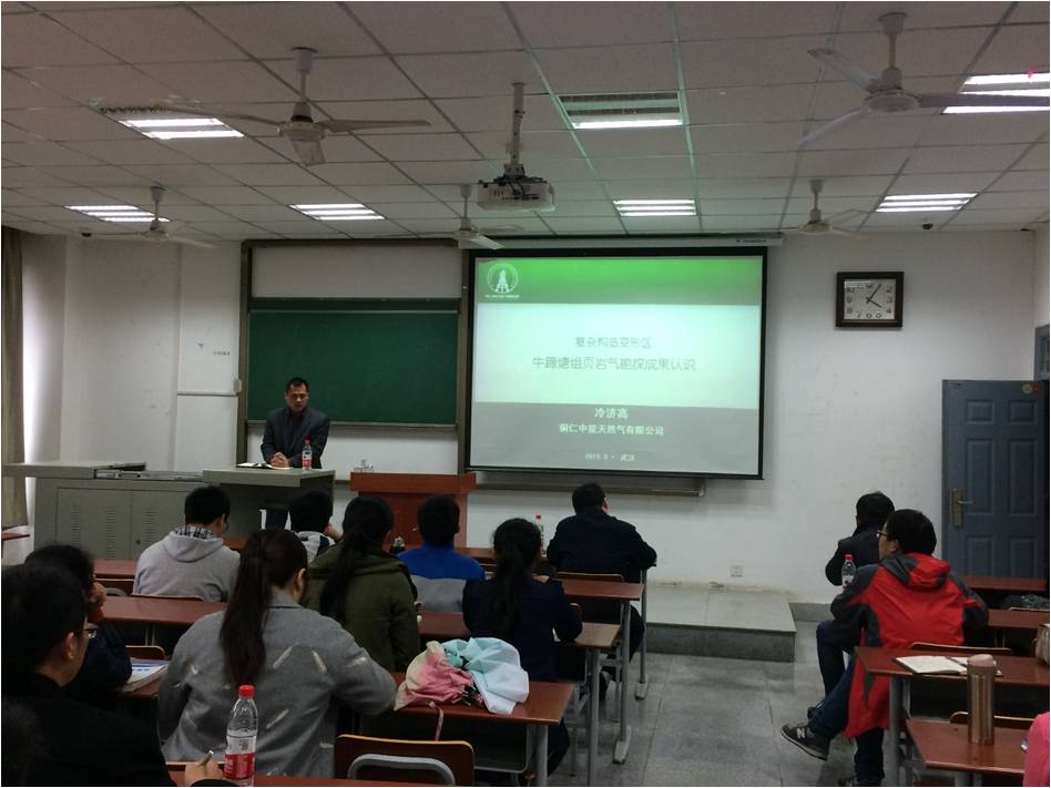 3月30日下午,中国国储能源化工集团股份公司总地质师冷济高博士在武汉校区武培A103进行了一场精彩的学术报告,吸引来自地环公司、地科公司、非常规油气湖北省协同创新中心的广大师生,学术报告会由地环公司副经理唐友军主持。