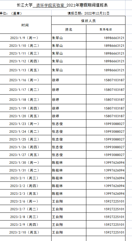 yl23455永利 yl23455永利实验室 2023年寒假期间值班表