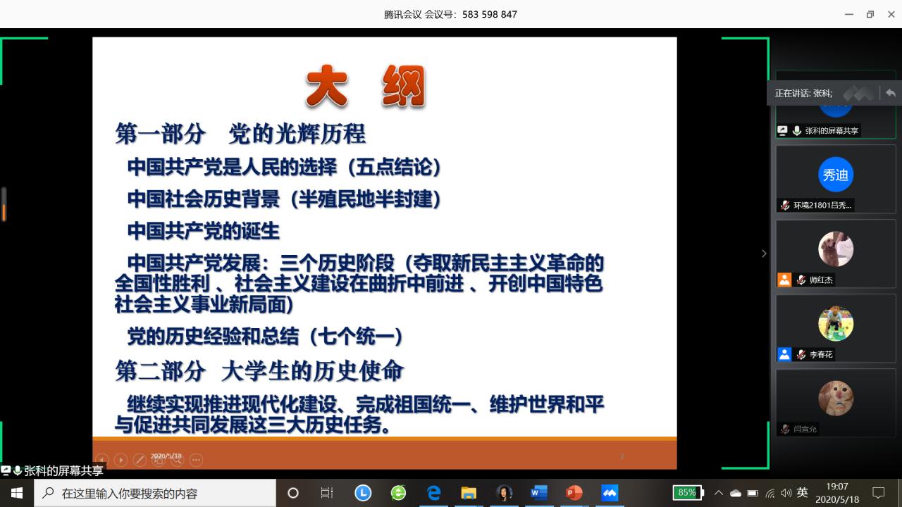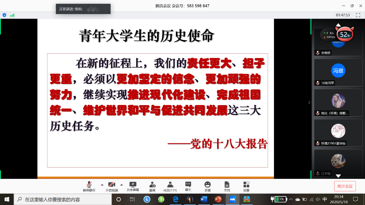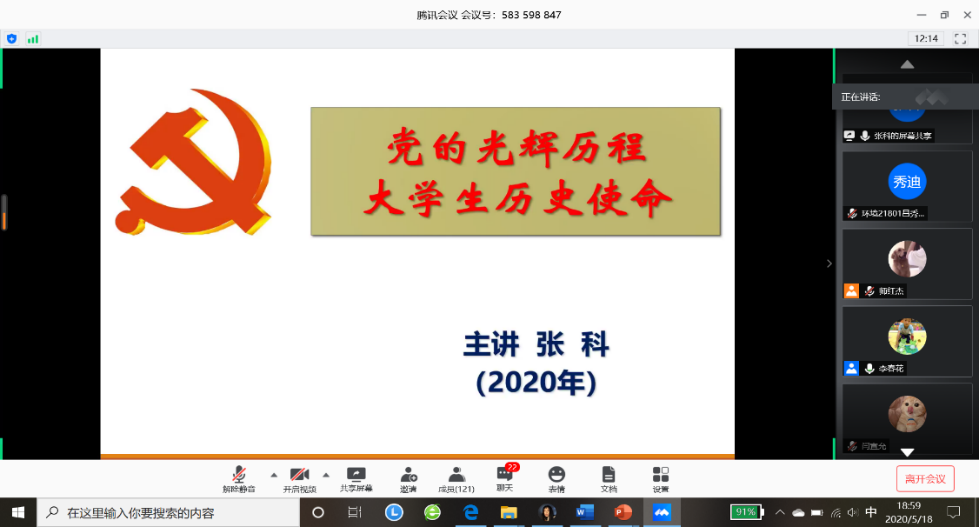 (图/文:吕秀迪)为进一步做好资源与环境公司党员发展工作,加强对发展对象和入党积极分子的教育和培养,引导其提高思想觉悟,保证发展新党员的质量。​yl23455永利于2020518日晚1900以线上腾讯会议的形式举行了2020年上半年入党积极分子和党员发展对象培训会议。公司党委书记张科主讲,党委副书记范梅英参加、本科员工工作党支部书记李春花主持,共130余名入党积极分子和党员发展对象线上学习。