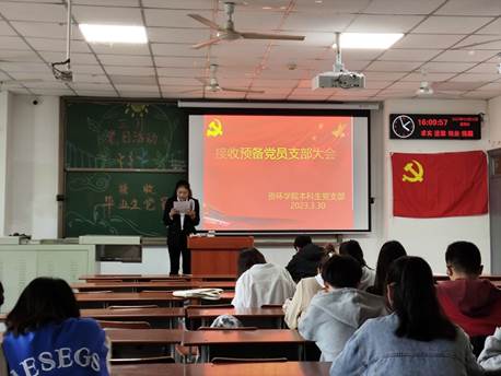 本次接收的毕业生预备党员为环境21902班的邓丽蓉同学,由于各方面表现突出,成绩优异,在疫情形势严峻时期无私奉献、帮助同学,经党组织综合研究决定接收邓丽蓉同学为中共预备党员。邓丽蓉同学表示:自己将时刻以党员的标准来要求自己,不断努力、不断上进,成为党员不仅是一份荣誉,更是一份责任。