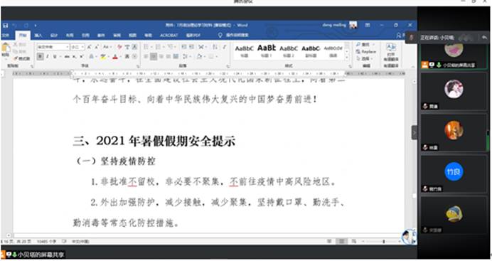 除学习党的相关会议精神外,随着暑假的到来,各班再次强调了暑假安全及留校相关手续的办理工作,由各班班长带领大家具体解读暑假留校研究生申请文件以及留校注意事项,严格按照员工本人申请、家长和导师同意、培养单位审批的程序,严禁在寝室、办公室、实验室使用违规电器,每天健康打卡,同时还进行防溺水、运动安全、交通出行、饮食安全、防火防盗、安全防疫等方面安全知识学习,安全无小事,警钟需长鸣,提高大家安全意识。