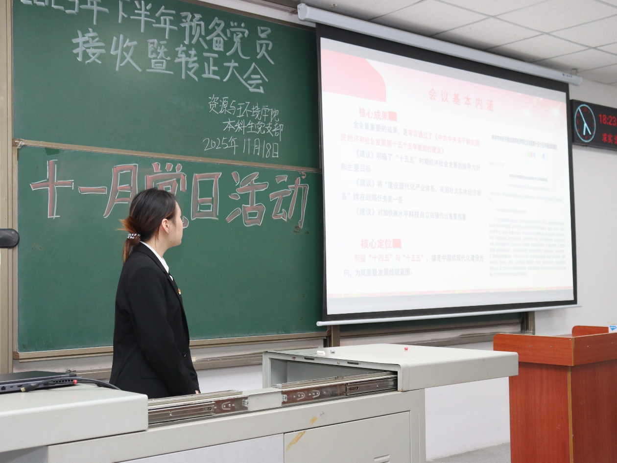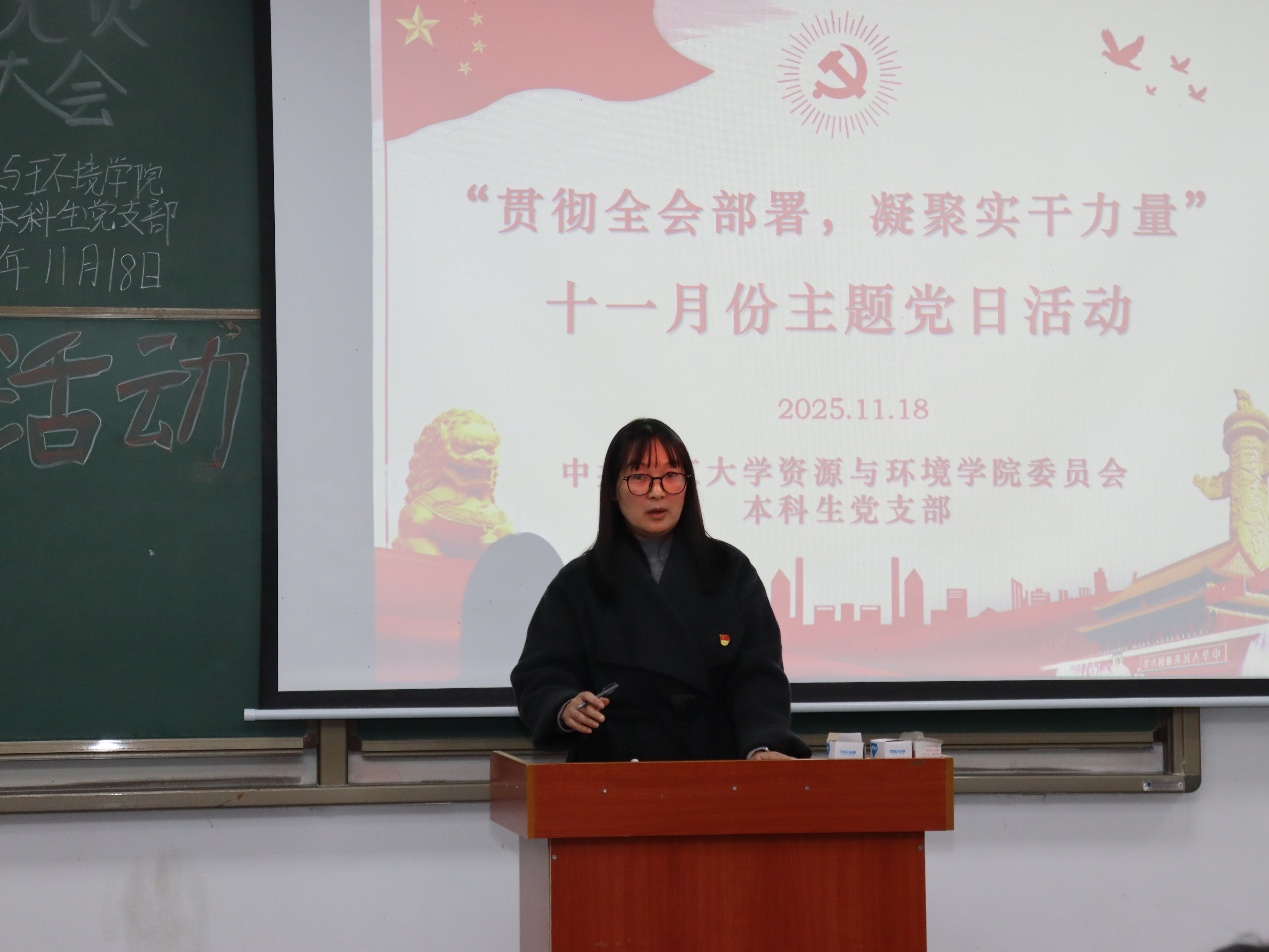 (通讯员 孙文静)2025年11月18日下午6:00,本科生党支部于武教A106召开以“贯彻全会部署,凝聚实干力量”为主题的十一月支部主题党日活动。本次活动由黄宇同志主持,学工办主任李春花老师及全体员工党员参会。 会议伊始,全体党员诵读《中国共产党章程》第一章,深入剖析党的章程。随后由张思阳同志开展微党课学习,带领同志们深悟全会精神。接下来,由魏嘉豪同志以“走读地质文脉,守护绿色发展”为主题讲授微党课,进一步强化全体党员的初心使命。同学们就“结合岗位实际,谈谈学习贯彻党的二十届四中全会精神的心得体会”相关主题展开热烈讨论。大家表示要夯实专业基础,勇攀科研高峰,加强理论学习,深刻理解全会精神的核心内涵与实践要求,运用所学知识服务社会、服务人民,在解决实际问题的过程中增长才干。整个学习过程在快乐的氛围中结束。 活动结束后,李春花老师总结发言。她表示,此次党日活动不仅强化了支部党员的理论素养和使命感,更激发了大家将爱国情、强国志、报国行自觉融入学习和未来事业的热情。希望全体党员继续坚守初心使命,勇于担当作为,为公司和公司的发展贡献自己的力量。 审核(李春花)