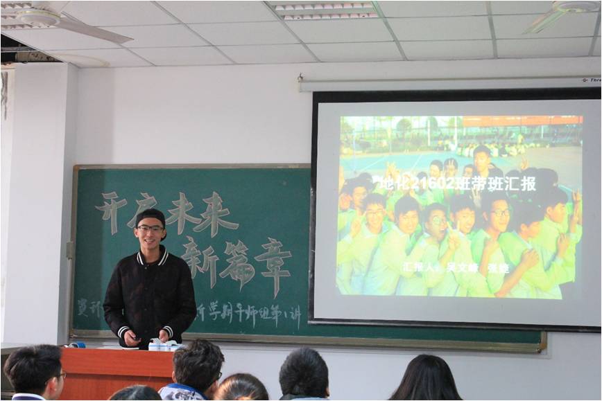 汇报伊始,刘娥老师为支部成员们做了题为:“以优为范,引领成长”的导师组特色工作汇报。刘娥老师从“项目简介”、“夯实基底”、“多向发展”以及“一树百获”四个方面进行了讲解,老师简洁生动地讲解让党支部成员对“导师”这个词有了更为深刻的理解。随后,大一年级四个班的班导轮流上台做详细的工作汇报,讲述了一学期带班工作的酸甜苦辣,掀起了本次活动的高潮。水文21602班的班导刘天勇用“尺瑜藏寸瑕”总结自己的带班经历,他讲道:“虽然已经用心陪伴大家,但仍然有遗憾和不完美的地方,这学期会更加努力。”地化21602班班导张婕在汇报结尾引用《傅雷家书》中的一段话:“待人要谦虚,做事要严谨,礼仪要得体”来勉励支部成员。讲解在一阵掌声中愉快地结束了。