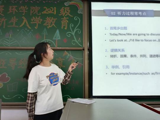 四级是每个老员工都要通过的一项考试,而其中的听力部分又是同学们很难攻克的一道关卡,环科类22102班的班导沈佳怡就针对四级听力开展了具体的分析。同时,面对长战线的复习和短时间的速成,她提出了不同的学习方法。沈佳怡的讲解让现场所有人,尤其是高考没有考听力的部分同学受益匪浅。