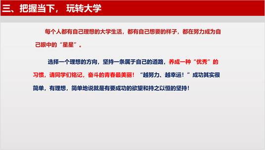 “把握当下,玩转大学”。大学自由支配时间多,她强调同学们一定要有自我约束力,要学会管理时间;在大学里交一批朋友、学一些知识、找一个方向、谈一场恋爱、培养一些爱好、锻炼一下身体;选择一个理想的方向,坚持一条属于自己的道路,养成一种“优秀”的习惯,请同学们铭记,奋斗的青春最美丽!