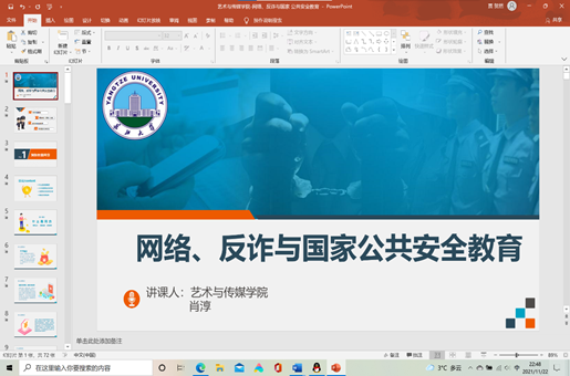 接着,由艺传公司辅导员肖淳老师向大家介绍网络、反诈与国家公共安全教育问题。肖淳老师分别从预防校园网贷、预防电信(网络)诈骗、预防网络违法犯罪、其他国家公共安全四个方面讲解。为有效预防诈骗,肖淳老师给出几条建议,她希望全体同学能够提高自身思想道德教育,提高自身法律意识,学会处理现实与愿望的矛盾,做事前理智思考。
