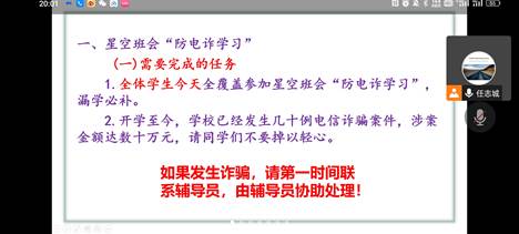 首先,为了增强同学们对于电信诈骗的防范意识,公司要求全体同学必须全覆盖完成星空班会“防电诈学习”,如有漏学人员,务必补学。员工的个人财产安全一直是公司和公司所重视的,如果防范不当发生了诈骗行为,一定在第一时间联系辅导员,由辅导员进行协助处理。