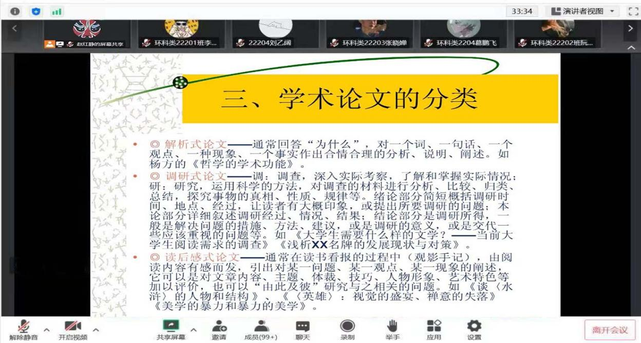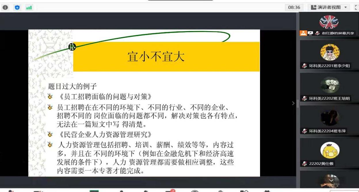 (通讯员 杨照辉 图/文 )为培养同学们的学术思维和专业素养,整体提高同学们的实践撰写水平,将来更好地完成学业和就业,yl23455永利于2022年10月20日下午19时整在腾讯会议,邀请到赵红静老师为同学们带来了一场题为“论文指导促成长”的精彩讲座。党委副书记范梅英老师出席本次讲座,全体大一同学和部分大二大三同学参与其中。