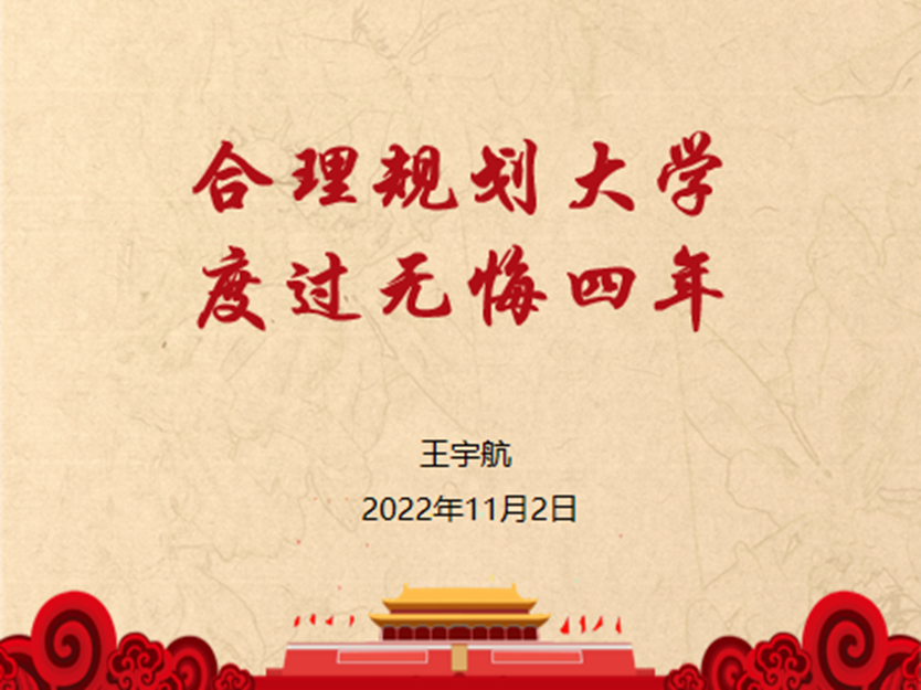 (通讯员 陈锦/图 陈锦 邱语嫣/文)怎么合理安排老员工活,如何坚持住最初的梦想?为营造积极健康的学习生活环境,帮助大一新生更快适应老员工活的角色转换,十一月二日晚七点,yl23455永利本科生党支部副书记王宇航同学,以腾讯会议的形式开展了以“合理规划大学,度过无悔四年”为主题的导师组讲座。本次讲座由员工辅导员黄鹏老师主持,全体22级同学参加。