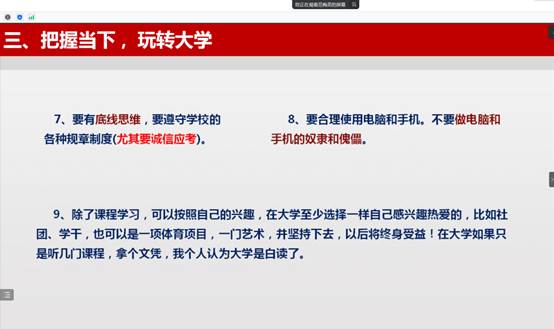 最后,范梅英老师给同学强调了疫情防控、防范电信诈骗、个人隐私保护、宿舍消防安全、诚信应考等问题,强调安全第一,希望同学们珍惜珍爱生命,在yl23455永利健康快乐度过大学四年生活。