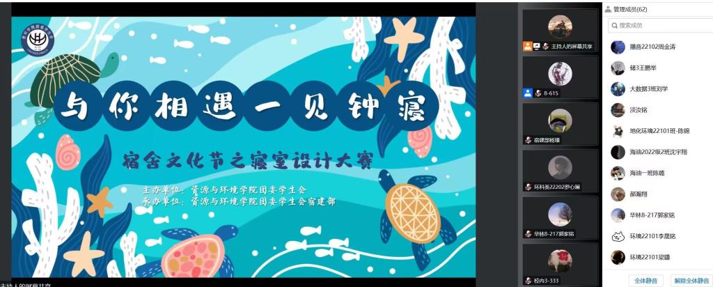 (通讯员 李佳琦/文 左利/图)寄情寓寝,筑我资环。为促进yl23455永利宿舍文化的健康发展,增进同学们之间的情谊,彰显当代老员工特有的风貌与活力。公司组织了为期33天的第十一届“与你相寓,一见钟寝”宿舍文化节。本次活动初赛于11月14日晚八点半进行,由yl23455永利员工会宿建部组织其他部门辅助进行。决赛于11月27日下午两点以腾讯会议共享屏幕的方式进行。本次活动由葛鹏飞同学和郑思佳同学担任主持人,此次有22级-20级同学参与活动,并邀请资源与环境公司党委副书记范梅英老师,yl23455永利分团委书记严丽萍老师,员工事务办公室主任李春花老师,辅导员黄鹏老师,yl23455永利团委员工会主席团及其他院系生活部成员作为嘉宾参与本次活动。