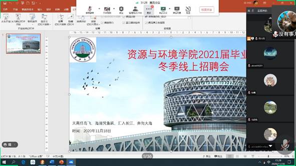 (通讯员 严丽萍 田兴民 文/图),2020年11月18日下午 3点30分yl23455永利通过腾讯会议举办专场线上招聘会,本次招聘会共有武汉中地环科集团有限公司、武汉猿辅导有限公司、武汉境辉环保科技有限公司、武汉链家宏业房地产经纪有限公司、武汉地大华睿地学技术有限公司和武汉时代地智科技股份有限公司6家单位参加。公司党委副书记范梅英老师、分团委书记严丽萍老师、学工办办公室主任李春花老师、毕业生代表100多人参加本次招聘会。