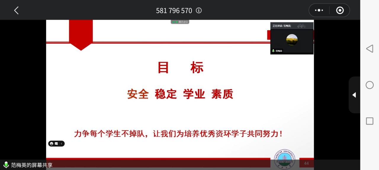 (通讯员 梁文萱 图/文)健康的心灵是幸福的源泉,良好的教育是成功的基础。为加强yl23455永利的心理健康教育,提高资环学子的学习能力。2020年10月19日晚上19时整,yl23455永利召开的以“守护心灵,助力未来”为主题的线上会议。本次大会由党委副书记范梅英老师主持。yl23455永利团委书记严丽萍老师,员工辅导员李春花老师,yl23455永利各班班主任出席了本次会议。