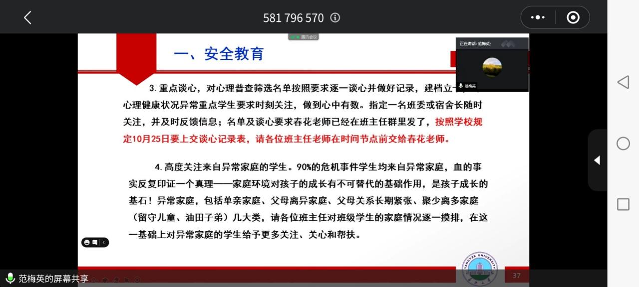 会议最后,由李春花老师补充说明 。她再次强调了员工心理健康教育问题的重要性,并对班主任在线上进行了访谈培训。她强调对于存在心理健康问题的员工,班主任们一定要主动去沟通,委婉地去了解员工的情况。比如在询问员工情况时,可以说:“你们家现在有几口人”“最近有没有遇见什么烦心事”等。以温和的语气和委婉的方式对员工进行细心地疏导。