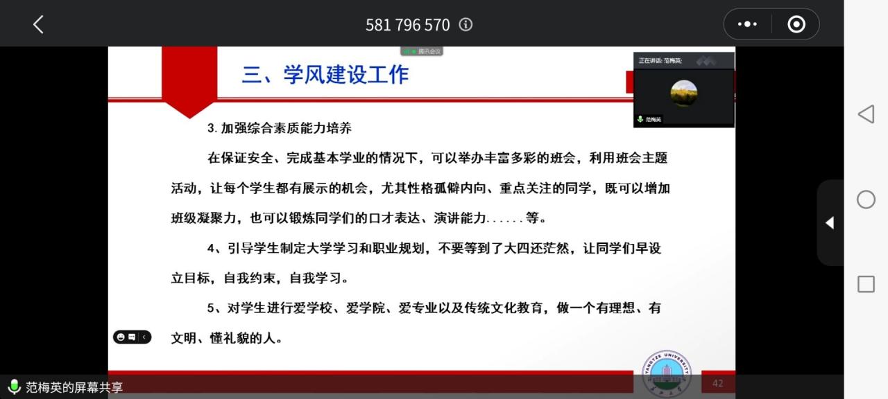 最后,范书记就公司学风建设提出了自己的展望。在英语交流日益广泛的现在,英语成为同学们走进社会不可或缺的本领。范书记心系学子未来,鼓励19级和20级的班主任们更加重视同学们的英语四级学习,让资环学子在激烈的社会竞争中不会掉队。与此同时,范书记也努力将资环学子发展有能力,有温度的人。通过公司的各项活动,锻炼同学们的口才表达,演讲能力,在温馨和谐的氛围中养成同学们爱校园,爱公司的良好习惯 。