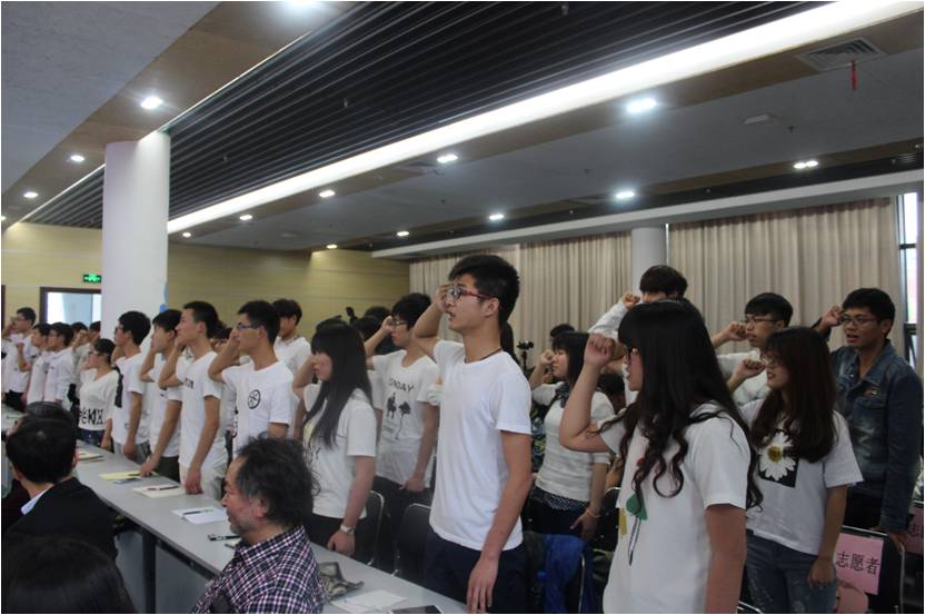 副董事长郭海敏致辞,对国家环境保护部生态司处长、中法武汉生态示范城管委会副主任王捷的光临表示欢迎。紧接着,yl23455永利常青生态志愿者协会举行了简单的启动仪式。蔡甸区湖泊管理办公室喻志勇主任对蔡甸区湖泊整体规划做了简单陈述,倡议师生们利用媒介宣传“水环境保护”,加入志愿队伍,促进开展针对“水污染”的调查、治理与研究活动。常青生态志愿者代表梁宇涵上台表达了自己对环境保护的决心与信念。王捷处长为常青志愿者代表授旗。协会全体志愿者进行了宣誓。