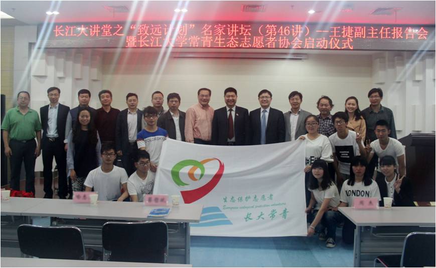 (员工记者 齐玉琴 见习记者 徐紫霞/文 员工记者 曾宪/摄)4月26日下午2时许,“长江大讲堂之‘致远计划’名家讲坛第46讲暨yl23455永利常青生态志愿者协会启动仪式”在武汉校区图书馆二楼报告厅举行。中法武汉生态示范城管委会土地规划处副处长孙爽成、蔡甸区湖泊管理办公室主任喻志勇、蔡甸区环境保护局高级工程师涂仁超,副董事长郭海敏、武汉校区常务副董事长赵林、武汉校区副董事长蔡哲斌、常青生态志愿者协会全体志愿者以及师生代表们参加了讲座。