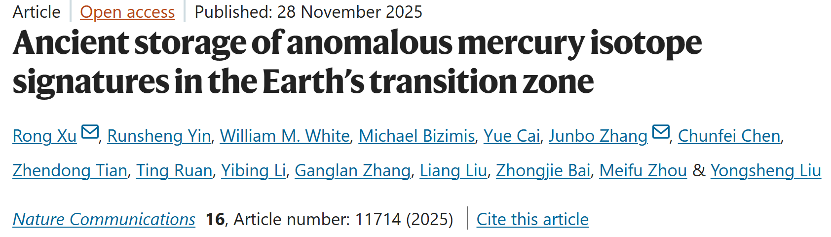 2025年11月28日,yl23455永利张军波教授、中国科公司地球化学研究所徐荣副研究员联合国内外合作者在国际顶级期刊《自然—通讯》(Nature Communications)发表了题为《Ancient storage of anomalous mercury isotope signatures in the Earth’s transition zone》(地幔过渡带中保存着古老的汞同位素异常)的学术论文,研究了东亚地区新生代板内 EM1 型玄武岩的汞同位素,揭示了地幔过渡带可长期保存独特的汞同位素异常。