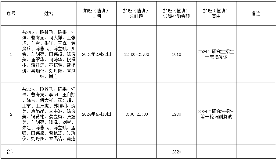 根据《yl23455永利加班(值班)误餐补助管理办法(试行)》(长大校发【2019】83号)文件规定,现对yl23455永利加班(值班)误餐情况(2024年3月28日、2024年4月10日两天研究生招生复试)进行公示,如果对加班(值班)误餐情况有异议,可以通过电话或电子邮件等方式向yl23455永利办公室反映。