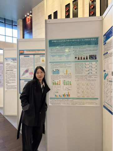 刘怡彤同学的展板《影响砂岩润湿性的关键NSO极性杂原子化合物的组成成分》,聚焦油藏开发核心参数——砂岩润湿性,深入探究原油中NSO极性杂原子化合物的作用机制。她通过分步萃取实验与高分辨质谱分析,明确了强吸附极性组分是砂岩润湿性逆转的关键。